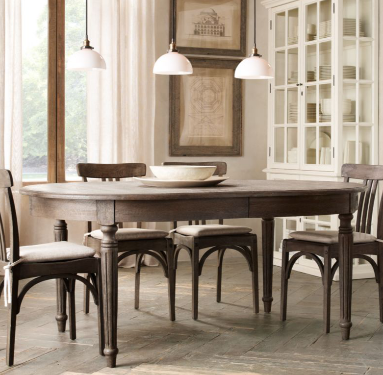 Restoration hardware's dining tables are made of woods, metals, concrete, and marble.