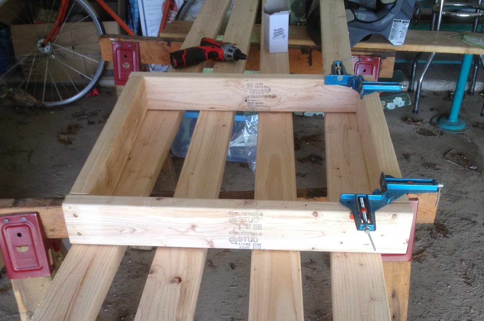 You could go bigger if you want more work space surrounding the table saw, but i was more concerned with mobility since i'll be pushing it with the plywood in place around the table saw, from underneath the bench i marked the outside edges of the 2x3 supports for the miter saw.
